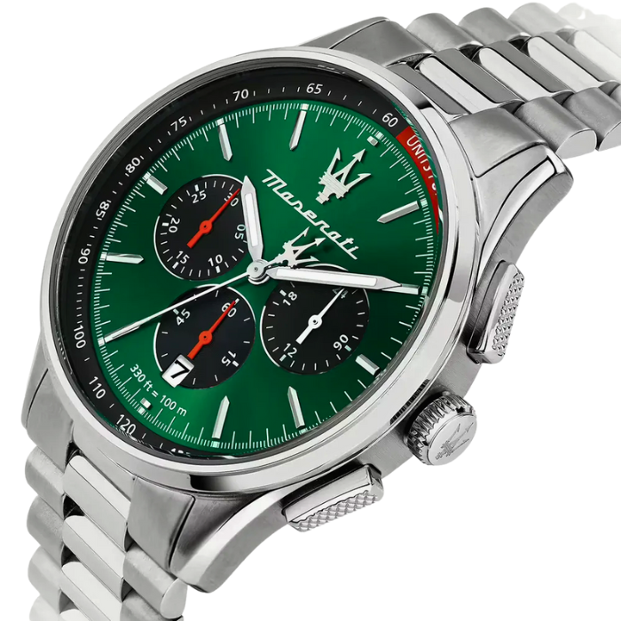• Maserati branding on crown, dial, and clasp