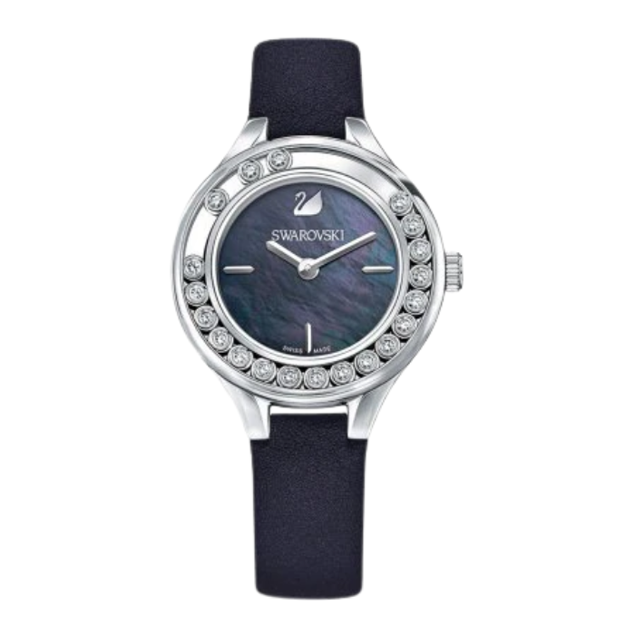 Elegant and glamorous, the Swarovski 5242898 Lovely Crystals watch for women features a 31 mm stainless steel case with 20 shimmering crystal elements, contrasted by a black mother-of-pearl dial and silver-tone hands. It’s powered by a precise quartz movement, paired with a black genuine leather strap, and is water resistant to 50 m — a perfect accessory for both day and evening wear.