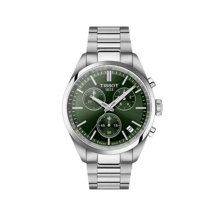 The Tissot PR100 T150.417.11.091.00 is a refined Swiss quartz chronograph featuring a 40 mm 316L stainless steel case, scratch-resistant sapphire crystal, 100 m water resistance, lumed hands, date display, and a green dial mounted on a silver stainless bracelet.